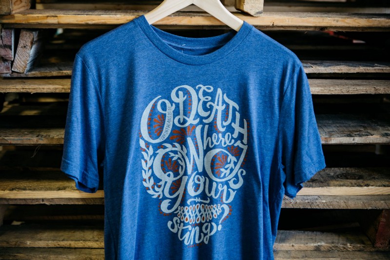 Notice in the photo above, the print is clear and still easily readable, but not quite as vibrant as you’d normally see. That’s because it’s printed on a blend, and not every thread in the shirt is being dyed. If this same design was printed on a 100% cotton t-shirt, or even a blend of a particular color, the print could be much bolder in color.