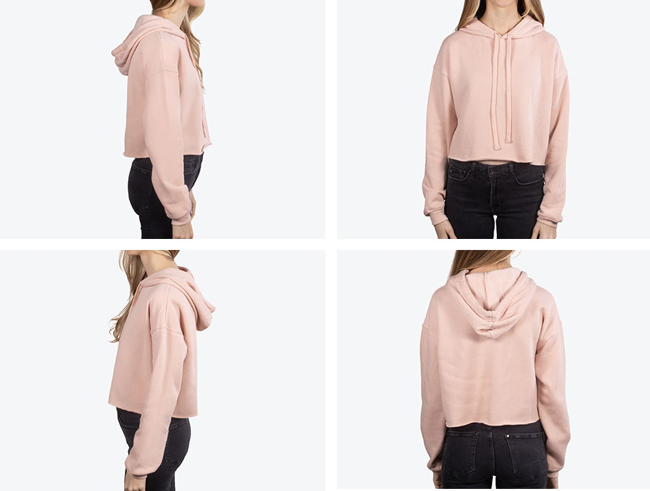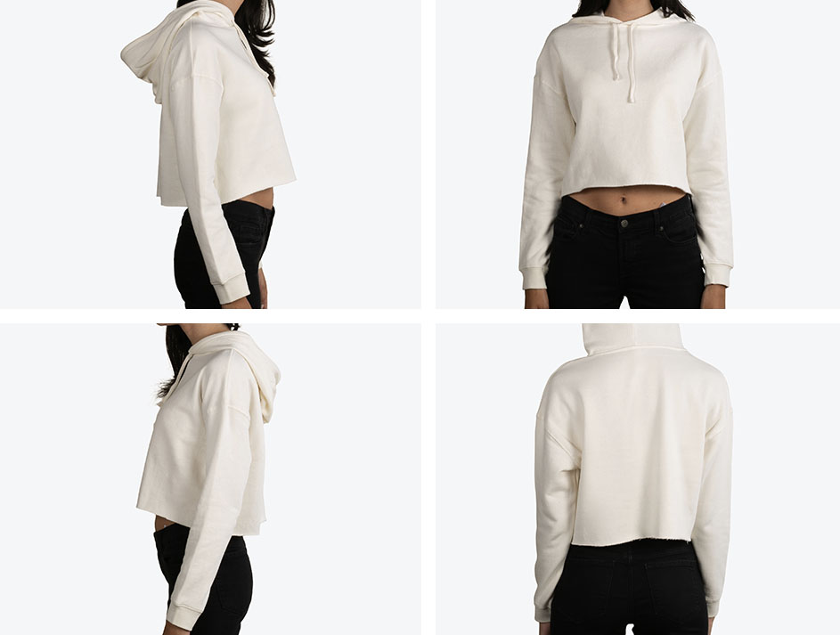 “Our women’s crop hooded pullover is slim fit, extremely soft with a raw edge waist.”