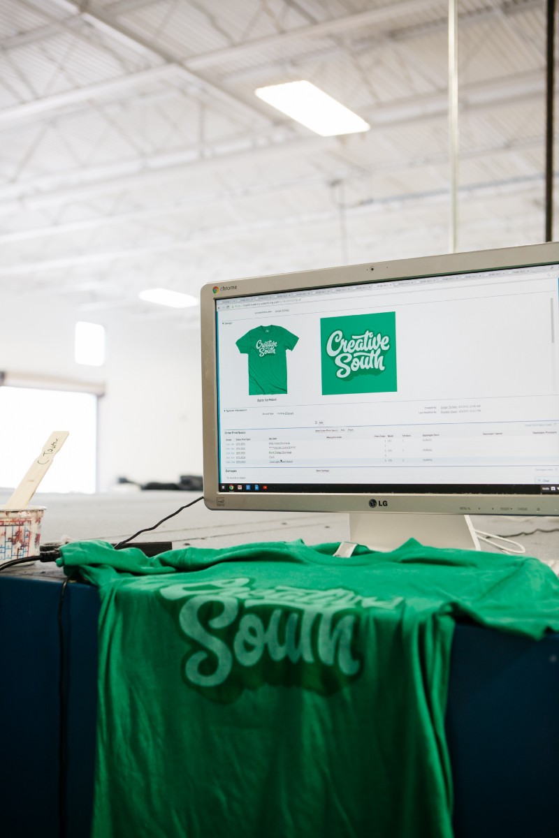 From there, they’ll load the shirts onto the dryer. This dryer isn’t quite like your standard clothing dryer at home. This baby’s MASSIVE, sending your shirts through on a belt where a catcher on the other end receives them. The catcher will hold your finished t-shirt next to your hi-res mockup to ensure the two are identical.
