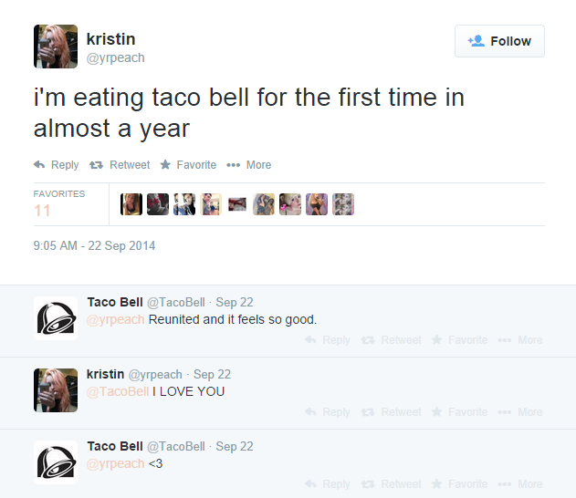 Even if you’re not crazy active on social, at the very least make sure someone has an eye on it. Even a polite, friendly, and timely response will harbor warm feelings between brand and customer, like Taco Bell did here: