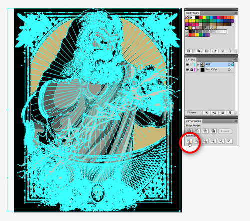 Nothing visibly changes at this point, but now we’re going to see some magic happen. Select all of your artwork and then go to the Pathfinder tool and click on the Divide button, which is in the bottom left of the Pathfinder toolbar. What this does is flatten and separate all of your artwork by color, leaving you with tons and tons of fragmented shapes.