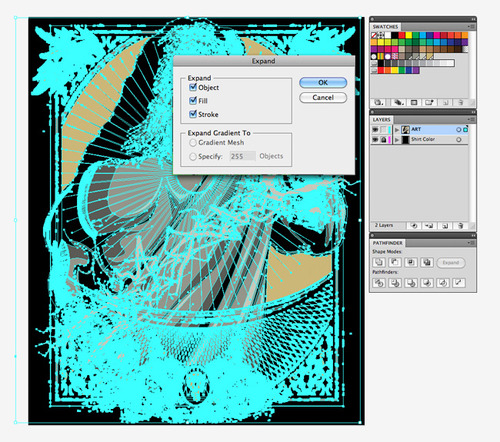 Now that your text is converted into outlines, we need to convert all of your strokes to outlines and expand your artwork into shapes. This is a two-part process. First, select all of your artwork and expand it’s appearance it by going to Object>Expand Appearance. Now, select all of your art again and go to Object>Expand. A box will pop-up, make sure you have Object, Fill, and Stroke checked and then hit the OK button.