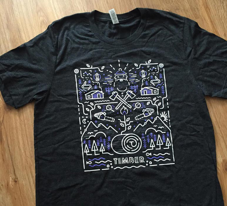 “As a designer mainly working with early stage startups, I tend to work on shirt design as part of the process of branding or designing a marketing website. It’s nice to be able to come up with something slightly different for a shirt but still fits within the look and feel of the company. The Timber example attached shows this, making use of the logo and assets I created for their marketing site but using a slightly different style to come up with an interesting shirt design.”