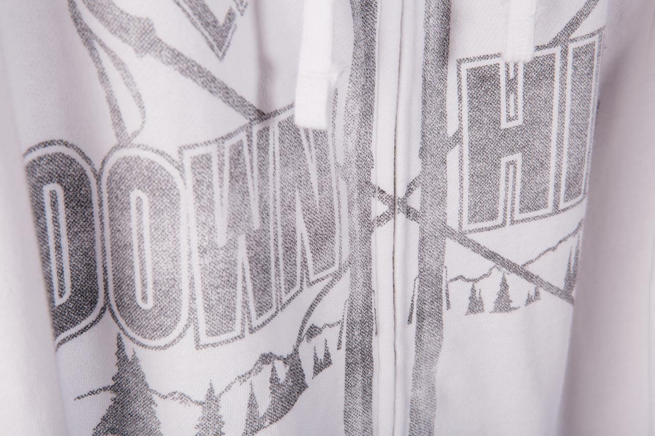 Because some print imperfections are to be expected, we always recommend designing custom zip up hoodies with a distressed pattern to achieve a more consistent overall look. Stay away from fine details like color blending or intricate designs when printing over the zipper.