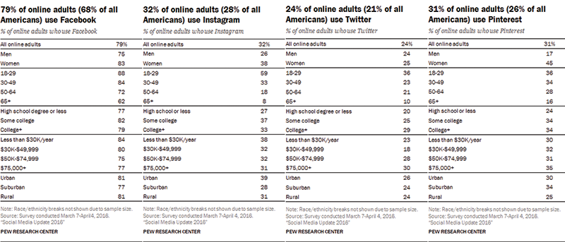 A great place to start is Pew Research’s Demographics of Social Media Users. This is annual report of which people are using which social media platforms year after year, and it serves as a great launching point for where you’ll want to focus your social media efforts.