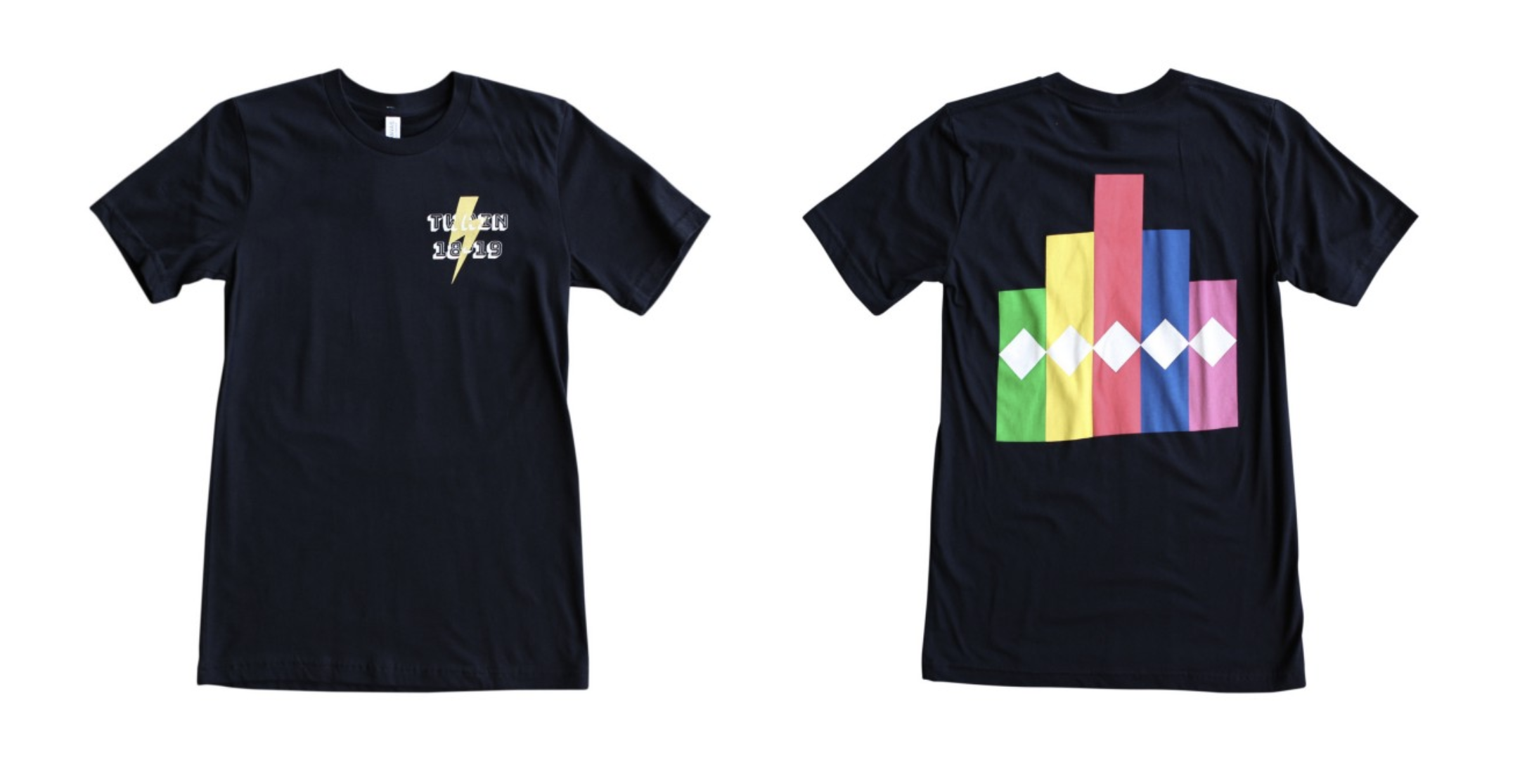 A small, left chest print with a larger print on the back is a look that will never go out of style, and it’s executed beautifully here. We love the use of bold, simple colors, and how much they pop on the black background.